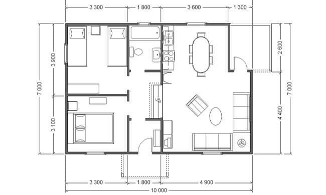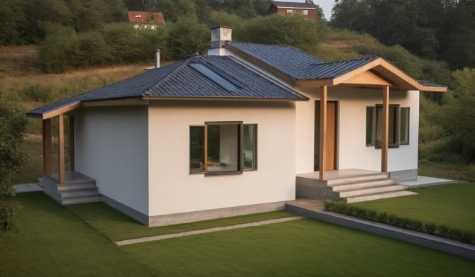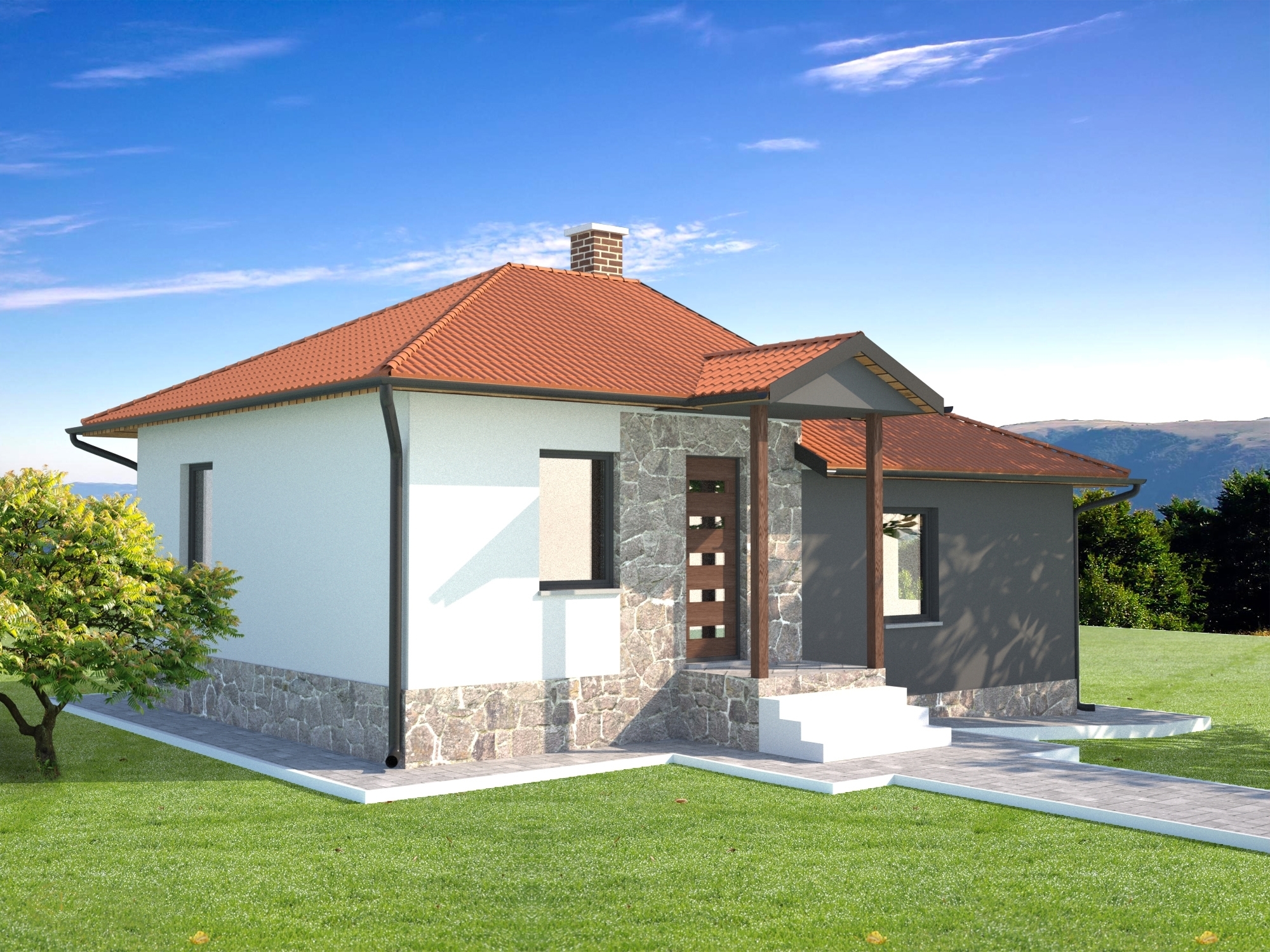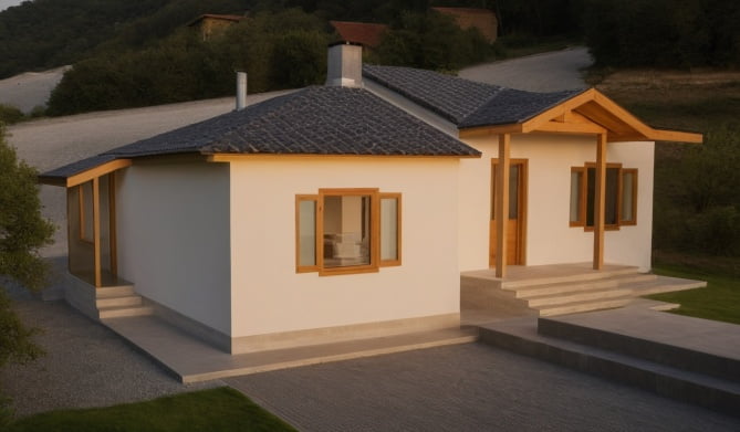 Stambena kuća TIP-68 bruto površine 76,35 m2(neto površine 68,32 m2) je projektovana kao trosobni stan jednostavne orijentacije za komforno stanovanje. Unutrašnji prostor je jasno podeljen u dve celine koje denivelacijom istuču svoju delimičnu individualnost. Dnevni boravak, sa otvorenom trpezarijom i kuhinjom zauzima nižu etažu, a dve spavaće sobe i kupatilo su u ravni višeg nivoa. Dnevni prostor obogaćuje natkrivena terasa. Razilka u visini se pojavljuje i u krovu, a natkrivanje ulaznog dela i terase obogaćuje arhitekturu krovnih ravni.